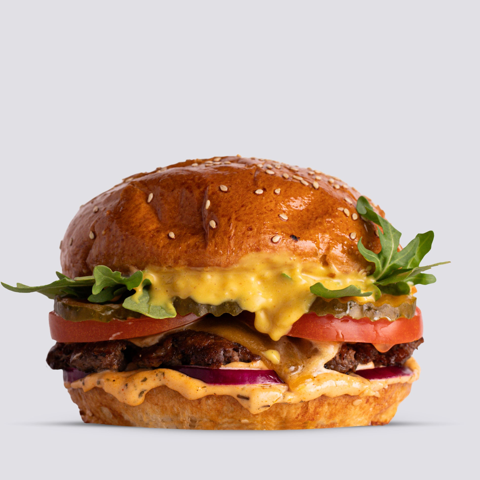 Rindfleisch Patty, irischer Cheddar, Rucola, Tomate, Gewürzgurken, rote Zwiebeln