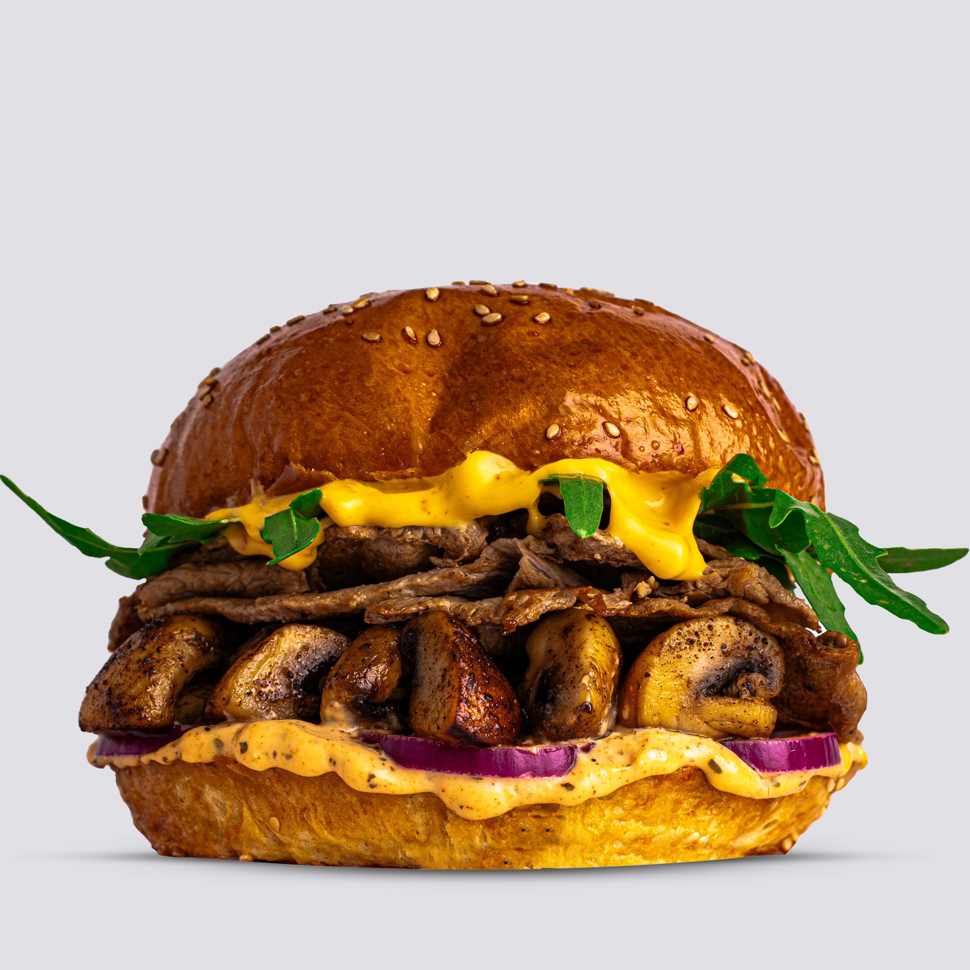 PHILLY CHEESESTEAK (AUS ≈ 150GR. FEINSTEM RUMPSTEAK), BÄCKER BUN,